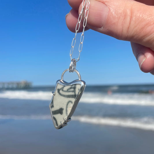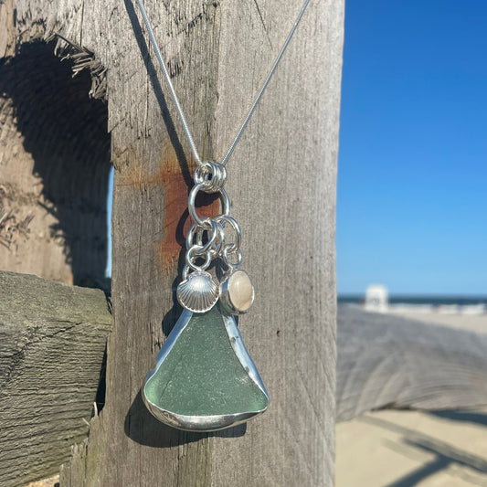 Each unique piece of jewelry is handmade from sea glass—naturally shaped by the ocean—that I’ve collected over the years. 925 Sterling Silver and Fine Silver is used for each piece of jewelry.