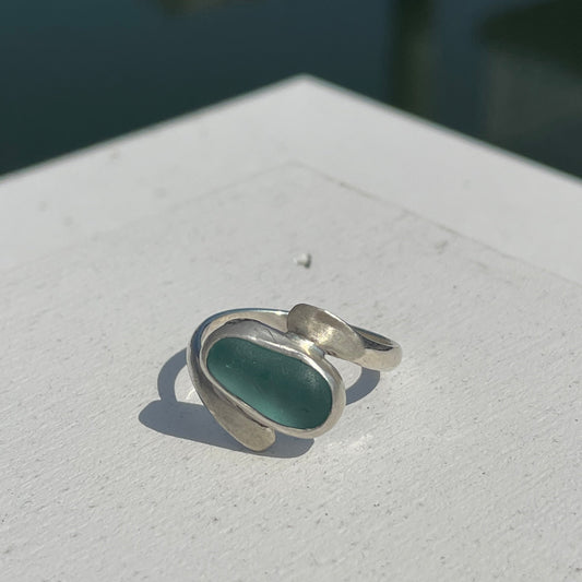 Dark Green Blue Sea Glass Ring - Size 9.75