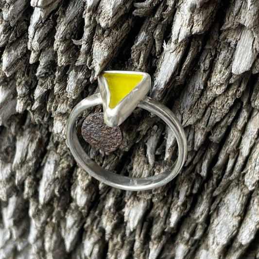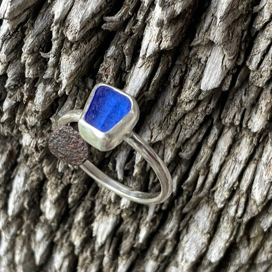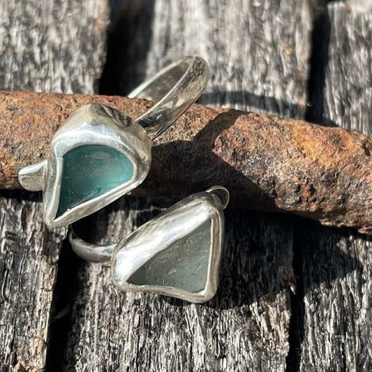 Double Teal Blue & Sea Foam Blue Sea Glass Adjustable Ring