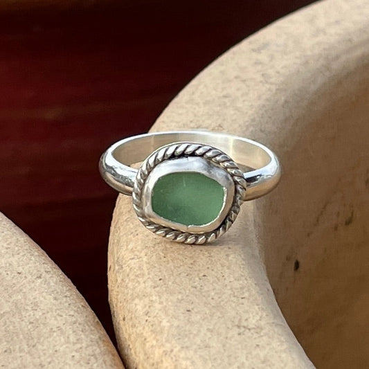 Rustic Beaded Sea Foam Green Sea Glass Ring - Size 7