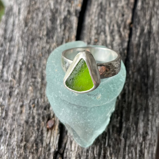 Lime Green Hammered Sea Glass Ring - Size 7.5