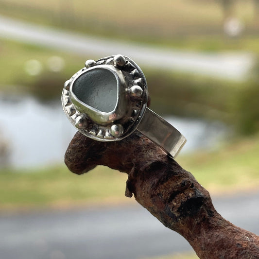 Rustic Beaded Light Sea Foam Green Sea Glass Ring - Size 8.5
