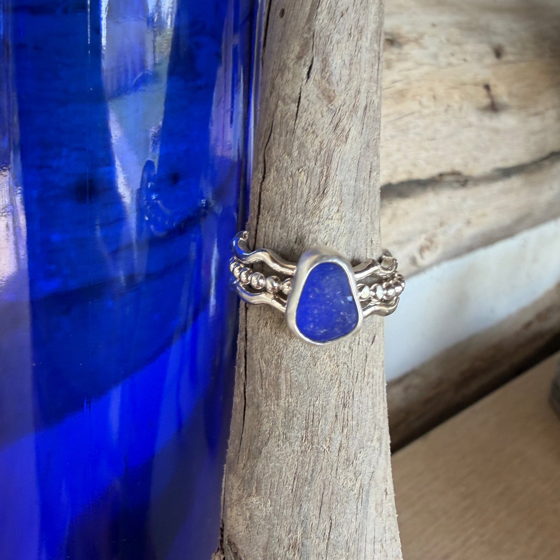This beautiful piece of Cobalt Sea Glass was found in Hawaii. 925 Sterling silver and fine silver was use to create this handmade ring. The stacking bands are wavy sterling silver. The main ring band is round. This collection includes three separate rings.