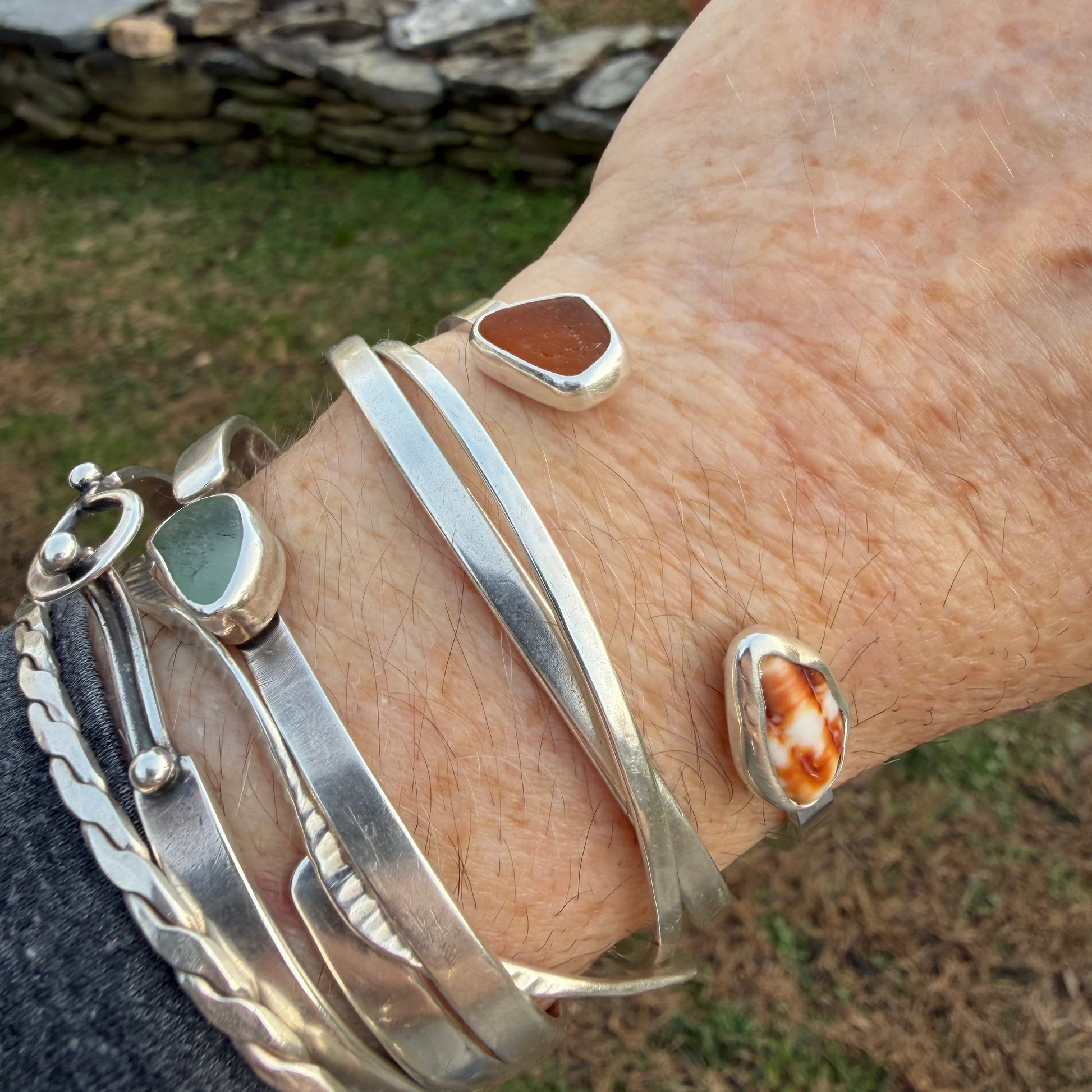 Honey Amber Sea Glass and a piece of an Amber Shell from Hawaii make up this double sea glass cuff bracelet. The cuff measures 4mm wide and 1.5mm thick. The sea glass and shell were found in Hawaii. 925 Sterling silver and fine silver were used to create this handmade bracelet. Size 5.75"