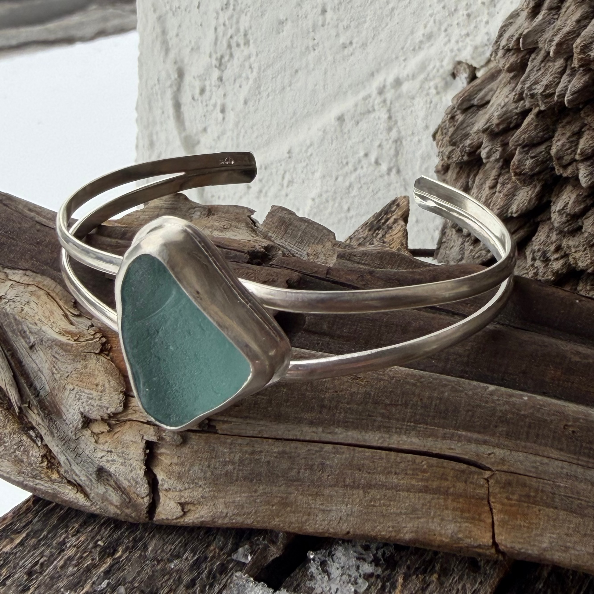 This piece of Pastel Blue Sea Glass was found in Hawaii. The double banded half round bracelet measures 5.75" with 1" opening. The sea glass measures 18mm x 14mm, It is made with 925 Sterling Silver and fine silver.