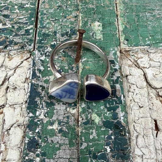 Cobalt Blue Sea Glass and Blue Sea Pottery Adjustable Ring -Size 8